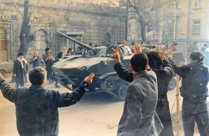 İnsanlar sovet tanklarının qarşısında etiraz edirlər. 20 yanvar hadisələri zamanı çəkilmiş şəkil