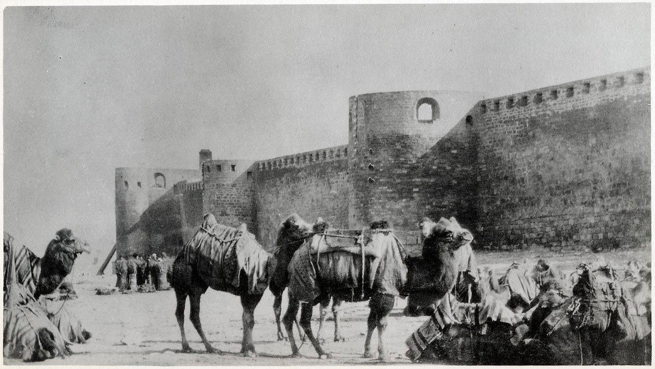 Qala divarları yaxınlığında dayanmış dəvə tacirləri. Bakı, 1898-ci il