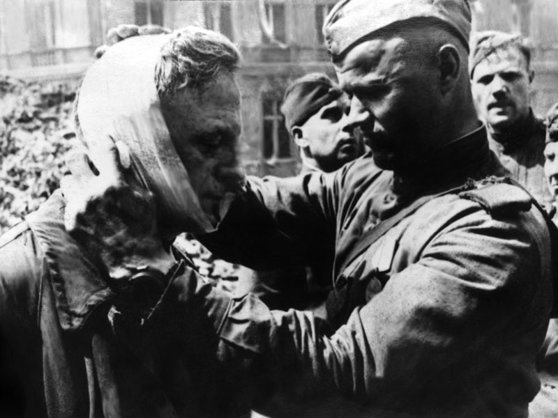 Sovet əsgəri alman əsirə ilk yardım göstərir, Almaniya, 1945-ci il