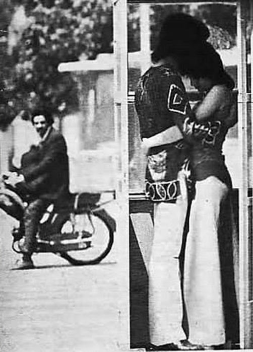 Aşiqlər telefon budkasında qucaqlaşırlar. İran, 1970-ci il