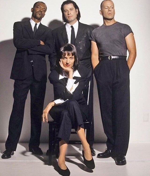 Semuel Cekson, Con Travolta, Brüs Uillis və Uma Turman "Kriminal qiraət" filminin çəkilişlərində, 1994-cü il