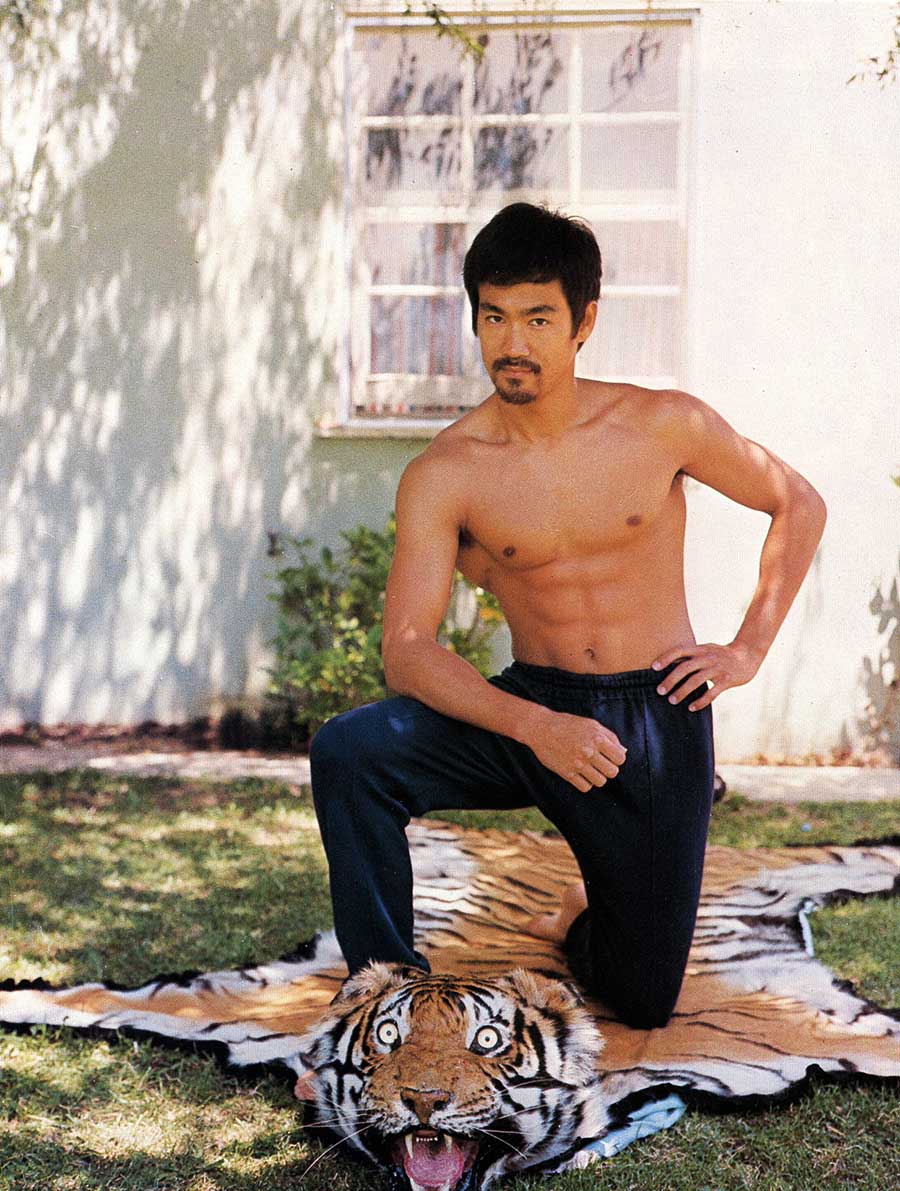Brüs Li pələng dərisi üzərində poza verir, 1960-cı illər