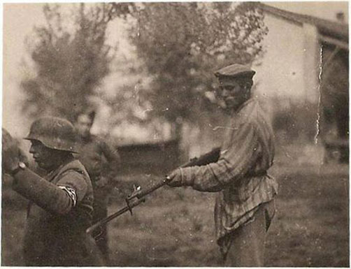 Azad edilmiş yəhudi alman əsgərini silahla hədələyərək saxlayır, 1945-ci il