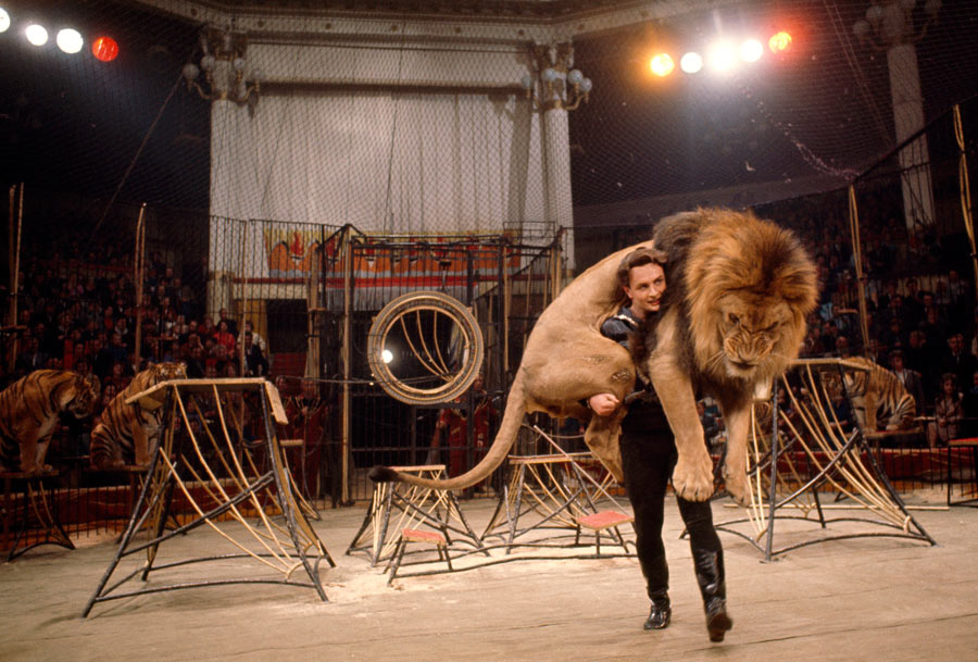 Heyvan təlimçisi sirk səhnəsində 136 kiloqramlıq şiri aparır, Moskva, mart 1966-cı il